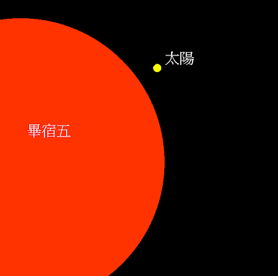 (畢宿5跟太陽比大小,畢宿5距離地球68光年遠)
